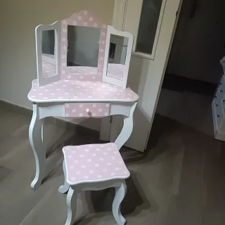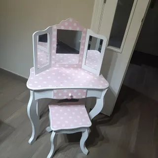 Bonito tocador infantil de madera con un diseño encantador. - Acabado en color rosa con lunares blancos. - Estructura principal en color blanco. - Incluye espejo triple. - Cajón central con tirador.