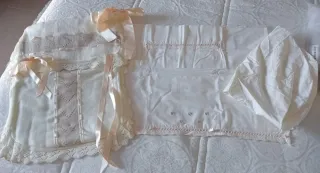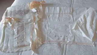 Conjunto de ropa de cuna y colcha para cochecito de bebé, con detalles de encaje y cintas. - Tejido suave y delicado. - Diseño con puntillas y lazos. - Incluye capota a juego.