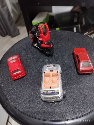 Conjunto de tres vehículos de juguete. - Coche deportivo plateado con detalles Sport y Champion. - Coche rojo tipo sedán. - Moto de tres ruedas roja y negra. - Tal como se ven en las fotos. - Para mas figuras y colecion en mi perfil, gracias.