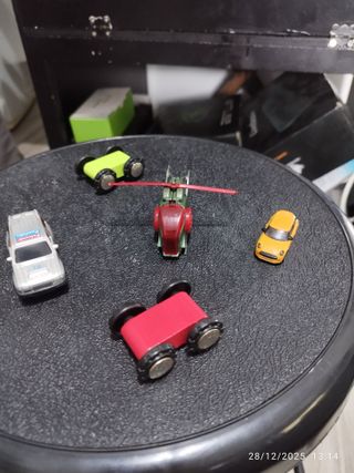 Conjunto de tres vehículos de juguete. - Coche plateado tipo SUV con dorsal 19. - Coche verde tipo buggy. - Vehículo verde y rojo con detalles. - Escala miniatura. - Tal como se ven en las fotos. - Para mas figuras y colecion en mi perfil, gracias.