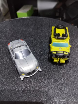 Lote de dos coches transformables, modelo 2006. - Un coche deportivo plateado. - Un vehículo todoterreno amarillo. Conjunto de tres vehículos de juguete. - Tal como se ven en las fotos. - Para mas figuras y colecion en mi perfil, gracias.