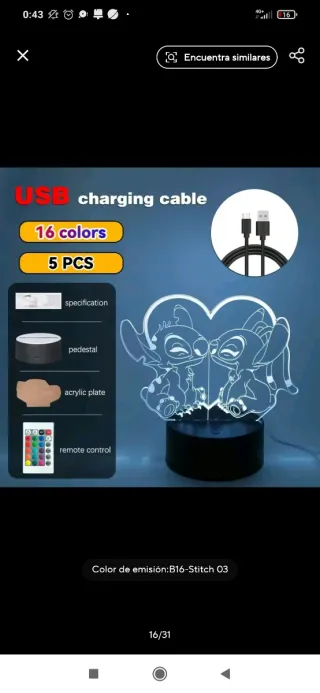 Lámpara de mesa con diseño de Stitch, ideal para habitaciones infantiles. Incluye control remoto para cambiar colores y efectos. - Base redonda. - Panel acrílico con grabado. - Cable USB para alimentación. Disponible más modelos