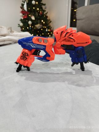Pack de dos pistolas de juguete, ideales para coleccionar o jugar. - Diseño llamativo en color naranja y azul. - Incluye gomas para las pistolas. - Tal como se ven en las fotos. - Para mas figuras y colecion en mi perfil, gracias.