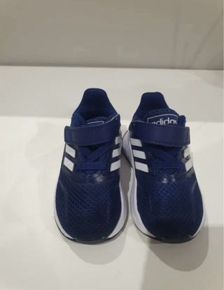 Zapatillas deportivas Adidas para bebé en color azul prácticamente nuevas. - Cierre de velcro. - Tres rayas blancas características de la marca. - Talla 18.