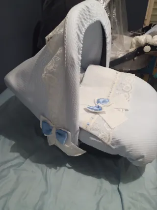Conjunto de carro de bebé completo en color azul, con un diseño elegante y detalles de encaje. - Incluye las 3 piezas principales del cochecito. - Adornado con un bonito encaje blanco y lazo. - Tejido suave y confortable.