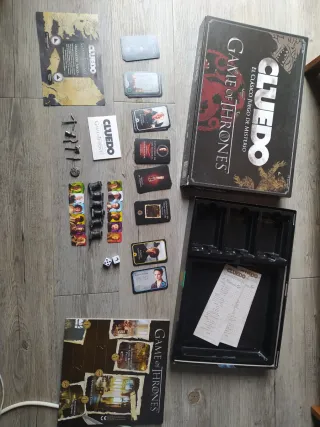 Juego de mesa Cluedo de Juego de Tronos. - Tablero con diferentes localizaciones como Túneles, Gran Bazar y Fosa de Daznak. - Cartas de personajes como Tyrion Lannister y Sansa Stark. - Incluye dados y fichas.