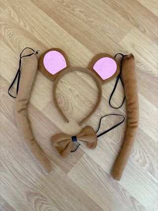 Conjunto disfraz para niños. Ideal para fiestas o juegos de rol. Incluye una diadema con orejas, dos colas y una pajarita. Diadema con orejeras de color rosa claro. El cordón de la pajarita se soltó nada más abrirlo pero hicimos un nudillo y listo (última foto). Tiene una postura. No recomendado para menores de 36 meses.