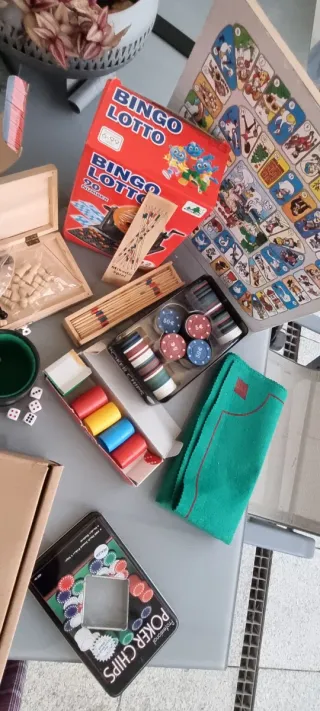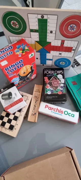 Lote variado de juegos de mesa, perfecto para disfrutar en familia o con amigos. - Juego de Bingo con 90 bolas. - Caja de Poker Chips profesional. - Juego de Parchís y Oca. - Palitos de Mikado. - Mini ajedrez.