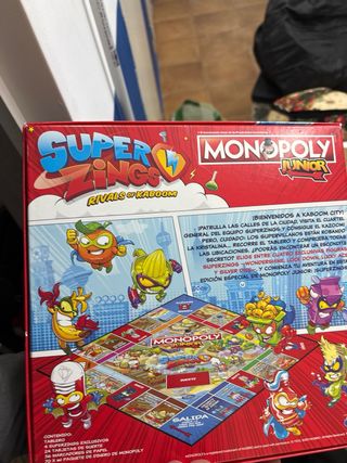 Juego de mesa Monopoly Junior con temática de Superzings. - Incluye 14 Superzings exclusivos. - Personajes: Orange, Juicer, Mr. King, Milkura. - Edad recomendada: 5+ años.