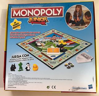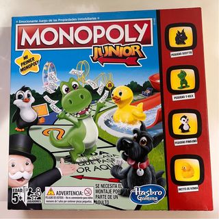 Juego de mesa Monopoly Junior, ideal para los más pequeños. Una versión emocionante del clásico juego de propiedades inmobiliarias. - Incluye figuras de personajes como un pingüino, un dinosaurio, un perro y un patito de goma. - Diseñado para 2-4 jugadores. - Edad recomendada: 5+ años. - Advertencia de seguridad: Contiene piezas pequeñas, no apto para niños menores de 3 años.