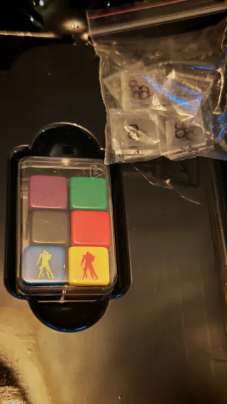 Juego de mesa para adultos Pacto de Amor con dados de colores y figuras. - Incluye 6 dados de colores: morado, verde, gris, rojo, azul y amarillo. - Los dados azul y amarillo tienen grabadas figuras. - Contiene piezas pequeñas en bolsas de plástico. - Juego de retos y pruebas de pareja.