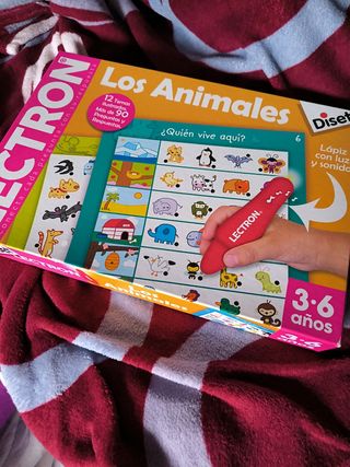 Juego educativo Los Animales de Lectron y Diset, ideal para niños de 3 a 6 años. Contiene 12 temas ilustrados con más de 90 preguntas y respuestas. - Incluye lápiz interactivo con luz y sonido. - Fomenta el aprendizaje sobre animales y sus hábitats.