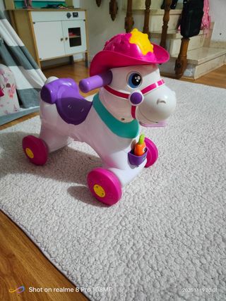 Caballo balancín de juguete para niños pequeños. Tiene un diseño colorido y divertido. - Asiento morado. - Sombrero rosa con detalles amarillos y azules. - Ruedas en la base para balanceo. 30e Mesa interactiva con sonido y luces 25e