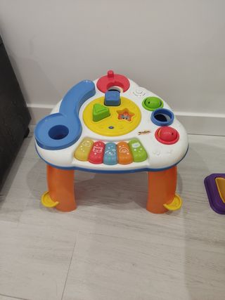 Un mesa de actividades que puedes hacer servir también sin patas sobre cualquier superficie. Ideal para estimular a los niños a partir de 12 meses, con piezas que pueden encajar y realiza sonidos, con pelotas que se deslizan, partes moviles para descubrir cosas, piano con cinco teclas, realiza sonidos, música y luces. tiene las 3 bolas le falta una estrella y el martillo