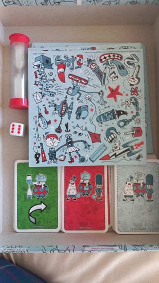 Juego de mesa Pictureka! de Hasbro, edición de 2014. Incluye cartas, dado y reloj de arena. - Cartas de misión verdes, rojas y azules. - Reloj de arena para controlar el tiempo. - Dado para el juego.