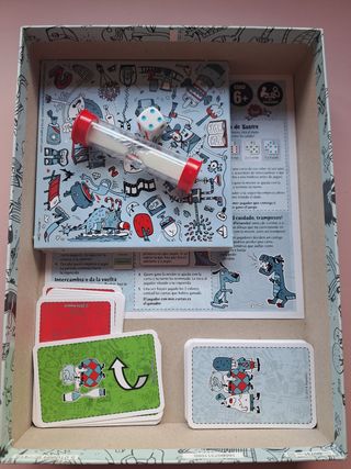 es un juego muy entretenido trae un dado, reloj de arena, instrucciones, 3 tipos de cartas y doble tablero (9 mini tablas por las dos caras)