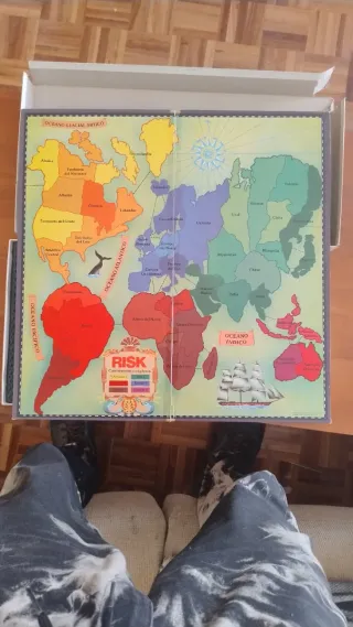 Juego de mesa clásico Risk, un juego de estrategia y conquista mundial. Solo usado una vez comprado en estos Reyes - Tablero con mapa del mundo. - Diseño inspirado en la cartografía antigua.