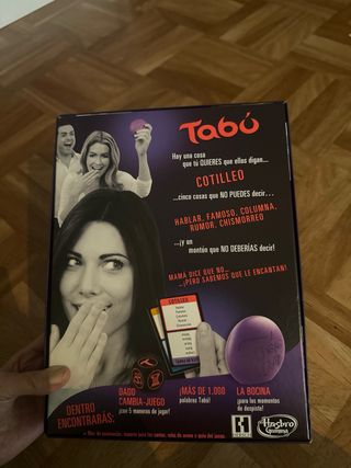 Juego de mesa Tabú de Hasbro, ideal para divertirse en familia o con amigos. El objetivo es adivinar palabras sin usar las prohibidas. - Contiene juego de mesa Tabú. - Empaque libre de plástico (excepto cinta adhesiva y pegamento). - Edad recomendada: 13+.