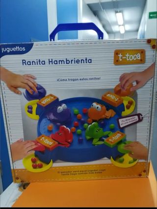 Divertido juego de tragabolas para niños. - Incluye base de juego azul. - Cuatro ranas de colores: naranja, rosa, morado y verde. - Bolsa con bolitas de colores para jugar.