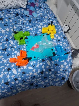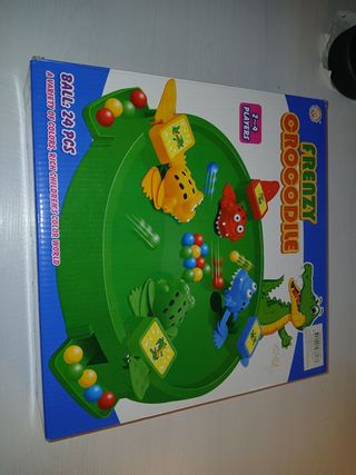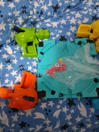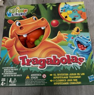 Juego Tragabolas en buen estado, con poco uso. - Incluye 4 hipopótamos de colores: azul, naranja, verde y amarillo. - Tablero de juego circular. - Palancas para mover las cabezas de los hipopótamos. Se perdio una bola roja, por eso le añadi una azul. Caja e instrucciones incluido. En la caja de carton se ve una pequeña rajita pero el juego no tiene nada roto