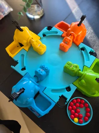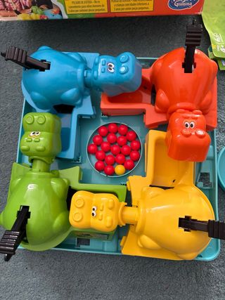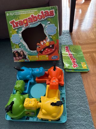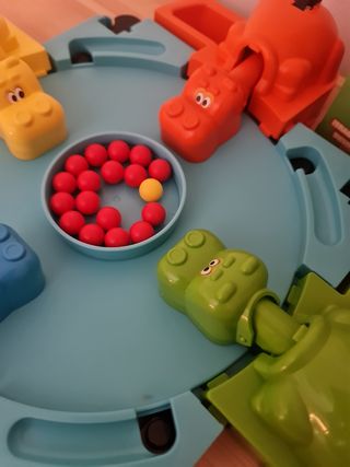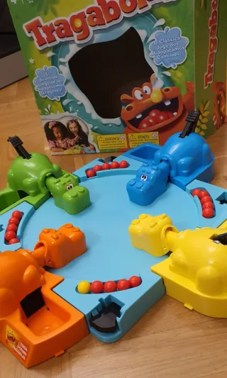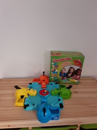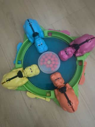 Juego clásico Tragabolas para divertirse en familia. - Incluye cuatro hipopótamos de diferentes colores: azul, naranja, amarillo y verde. - Contiene numerosas bolitas para que los hipopótamos se coman. Solo venta en persona en Parla