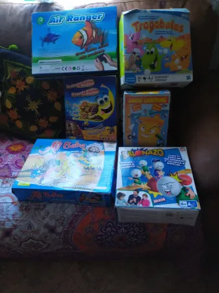 Última sale a menos de cinco euros el juego Conjunto de cinco juegos de mesa para niños. Están completos menos el camello le falta una carta pero no impide jugar - Air Ranger - Tragabolas - La alfombra mágica de Aladino - Jajugo Carcajino - Mi Baba / Balonazo