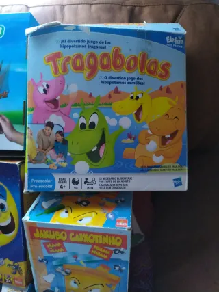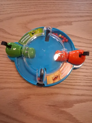 Divertido juego de mesa Tragabolas de Hasbro. - Juego de los hipopótamos tragones. - Incluye hipopótamo naranja y hipopótamo verde. - Para mayores de 4 años. Le falta alguna bola Cualquier juguete infantil de mesa de mi perfil en packs de 4 por 30 €excepto la última batalla.