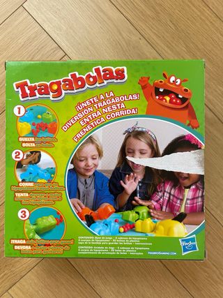 Juego de mesa Tragabolas de Hasbro. ¡El divertido juego de los hipopótamos tragones! - Incluye piezas para el montaje. - Advertencia de peligro de asfixia por piezas pequeñas, no recomendado para menores de 3 años. La caja tiene un par de imperfecciones que se hicieron al abrirlo la primera vez.