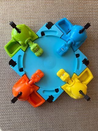 Juego de mesa Tragabolas con varios hipopótamos. - Incluye 4 hipopótamos de colores: naranja, amarillo, verde y azul. - Un disco central azul.