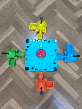Juego de mesa Tragabolas en buen estado. Incluye 4 hipopótamos de colores alegres. ¡Ideal para divertirse en familia! - 4 hipopótamos de plástico. - Base de juego circular. - Piezas coloridas y divertidas.