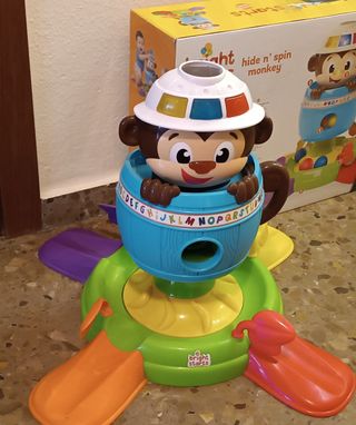 Juguete 6-36 meses, Spin Monkey Bright Starts, mono musical que sube y baja mientras suelta las bolas. Es gracioso y divertido. Música agradable, no machacona. Embalaje original. Montado: peana 48cm de diámetro. Nuevo costó 62,99€.