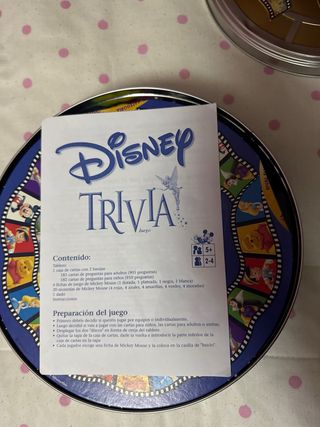 Juego de mesa Trivial Pursuit con temática Disney. Incluye tablero, fichas y dados. - Caja redonda metálica con diseño de carrete de película. - Tablero negro con estrellas y logo de Disney. - Fichas de juego con personajes Disney. - Caja de cartas con preguntas de trivia. Se incluye Party junior y conecta 4 Puede faltar alguna ficha