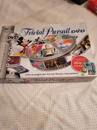 Juego de mesa Trivial Pursuit Edición DVD Disney. Se encuentra en buen estado, salvo por el tablero que tiene un pequeño desperfecto en la parte de atrás, tal como se aprecia en la foto, pero que no afecta a su uso. Precio no negociable, hago envíos únicamente por Wallapop y obligatoriamente se recogerá en mi barrio calle, más concretamente en mi calle. - Incluye tablero, fichas y DVD interactivo. - Con personajes de Disney y Pixar. - Diseñado para jugar en TV.