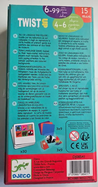 Juego de mesa Twist Up de la marca Djeco. Ideal para desarrollar el lenguaje. - Ilustraciones de animales. - Para edades de 6 a 99 años. - Autor: Babayaga. - Diseño: Margaux Carpentier.