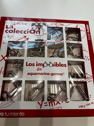Set de 12 juegos de ingenio metálicos de la colección Los imposibles de aquamarine games. - Diseños variados para desafiar tu mente. - Fabricados en metal resistente. - Presentados en su caja original.