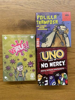 Pack de tres juegos de mesa. - Virus! - Polilla Tramposa - UNO Show 'Em No Mercy