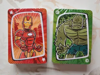 Juego de cartas Virus! con temática de Marvel. - Ilustraciones de Iron Man, Capitán América y Capitana Marvel. - Logo de Marvel incluido.
