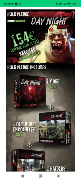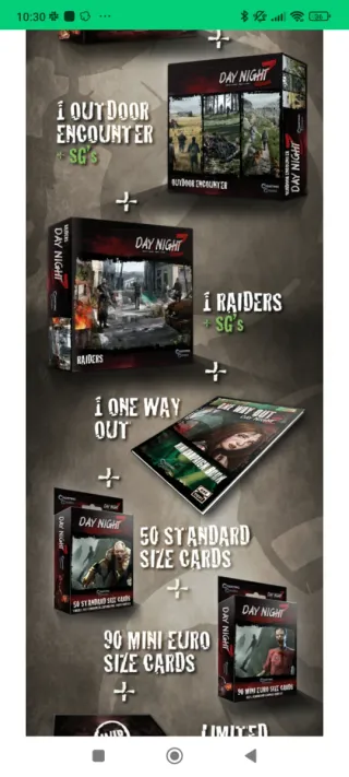 Juego de mesa Day Night Z de temática zombie. - Edición Hulk Pledge de Kickstarter. - Incluye 1 Core + SG's. - Incluye 1 Outdoor Encounter + SG's. - Incluye 1 Raiders.