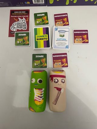 Juego de cartas Zombie Burrito, un divertido juego de balón prisionero donde los supervivientes se unen contra los zombis. Ideal para fiestas y reuniones. - Juego de cartas. - Temática de zombis y burritos. - Para 3-6 participantes. - Edad recomendada: 7+ años. - Duración aproximada: 15 minutos.
