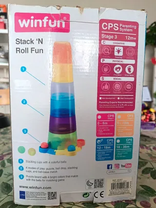 Juego de construcción con vasitos apilables y recorrido en espiral de bolitas, la torre alcanza 61 cm de altura La torre tiene 6 niveles divididos en vasos de colores (verde, morado, azul, blanco, naranja y amarillo), la base es un puzle de 4 piezas. Cada vaso tiene un agujero y un camino en espiral para dirigir las 4 bolitas desde arriba hasta la base, medidas de la base 23x23 cm. Las 4 bolitas están incluidas en el juguete.