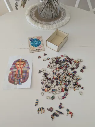 Puzle de madera con la silueta de un faraón, muy colorido. Piezas pequeñas y algunas de ellas tienen formas especiales. Viene también en una caja de madera. Montado en una única ocasión. Tanto para niños como para adultos ya que es complejo. Su precio de compra es de 12€. Rompecabezas, juego, juguete educativo, niño, niña, Egipto, Tutankamón, Montessori, Waldorf