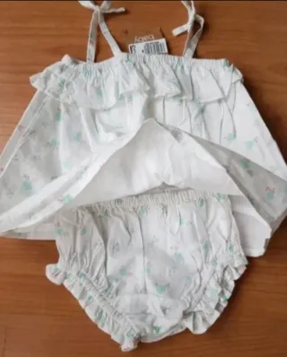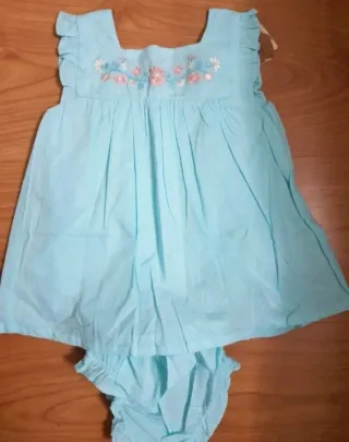 Conjunto de dos piezas para bebé niña, talla 9 meses. Incluye vestido y braguita. - Vestido azul claro con volantes en las mangas. - Bordado floral en la parte delantera del vestido. - Braguita a juego. Vestido de tirantes de color verde con bordados a contraste. Braguita cubrepañal a juego. Composición:100 % Algodón