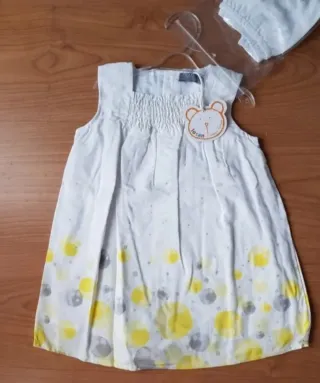 Conjunto de vestido y braguita de la marca Losan, talla 12 meses. Ideal para los más pequeños. - Vestido blanco con estampado de círculos amarillos y grises. - Detalle de fruncido en el pecho. - Incluye braguita a juego. Vestido de tirantes anchos, cuello cuadrado, de lunares, con smocks en el pecho, ranita de cintura elástica. El vestido es blanco, amarillo y gris claro y la ranita blanca COMPOSICIÓN: Vestido: 100% viscosa Forro: 100% algodón Ranita: 100% viscosa