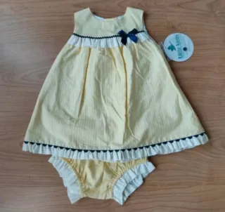 Conjunto de vestido y ranitas de la marca Miranda, talla 12 meses. - Vestido amarillo con rayas finas blancas. - Detalle de volante blanco con ribete azul marino y lazo azul marino en el pecho. - Ranitas a juego con volantes blancos y lazo azul en parte trasera. - Dispongo de conjunto a juego para niño mellizo