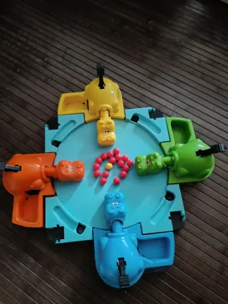 Juego de mesa Tragabolas sin caja. Funciona perfectamente. - Tablero de juego azul. - Cuatro hipopótamos de colores: amarillo, naranja, verde y azul. - Bolas rojas y una amarilla.