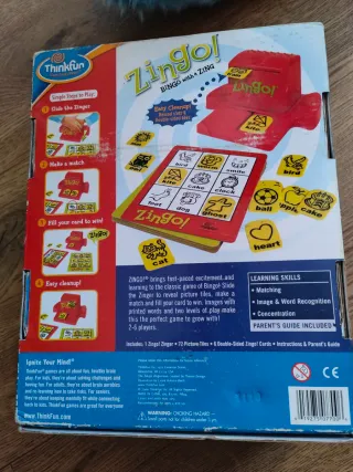 Juego de mesa Zingo! de Thinkfun, ideal para toda la familia. Con las palabras en inglés, ideal para aprender palabras en inglés básicas. Muy divertido - Juego de bingo con un giro. - Apto para 2 a 6 jugadores. - Recomendado para edades de 4 años en adelante. - Incluye advertencia de peligro de asfixia por piezas pequeñas.