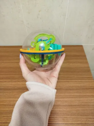 Laberinto 3D dentro de una esfera transparente con detalles en amarillo, verde y azul. - Diseño intrincado. - Ideal para ejercitar la destreza.