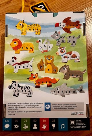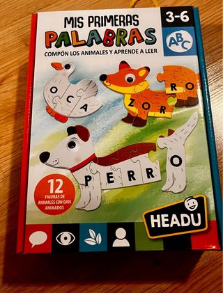 Juego de mesa Mis Primeras Palabras para aprender el abecedario y vocabulario. - Incluye 12 figuras de animales con ojos animados. - Fomenta el aprendizaje de palabras y animales. - Ideal para niños de 3 a 6 años. Esta nuevo como se puede observar que los ojos de los animales siguen estando en la bolsa de plástico.