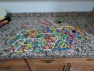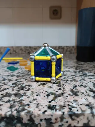 Juego de construcción Geomac con imanes para crear figuras. También incluye otros imanes similares de otra marca. Hay los que se ven en la foto. - Incluye varillas de colores (rojo, azul, verde, amarillo, blanco). - Bolas metálicas para las uniones. - Piezas adicionales de plástico y metal.