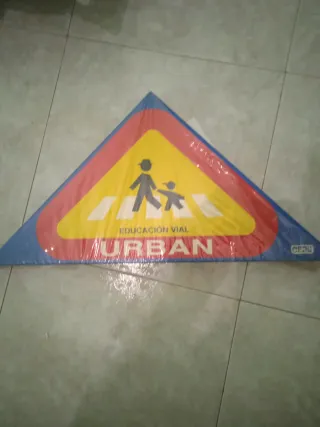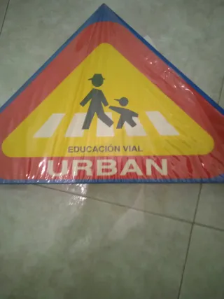 Señal triangular de educación vial con el lema URBAN. - Diseño de paso de peatones con figuras. - Colores amarillo, rojo y azul. - Incluye texto EDUCACIÓN VIAL.